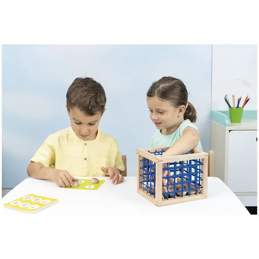 NathanSkynjunarkassi með teygjum Hvað kemur upp úr kassanumLitir eða tölustafir Börnin stinga höndunum í gegnum teygjurnar til að grípa liti eða tölust...